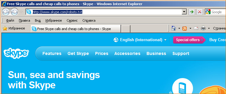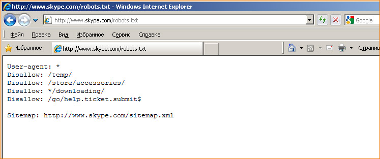 Текстовый файл robots.txt согласно общепринятому стандарту располагается «в корне» сайта и всегда открыт для чтения – в первую очередь, как следует из названия, роботам поисковых систем. Однако вы свободно можете открыть robots.txt любого сайта с помощью своего браузера. Посмотрим, например, файл сайа skype.com, просто дописав в адресной строке на главной странице «robots.txt» после слэша: