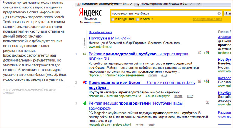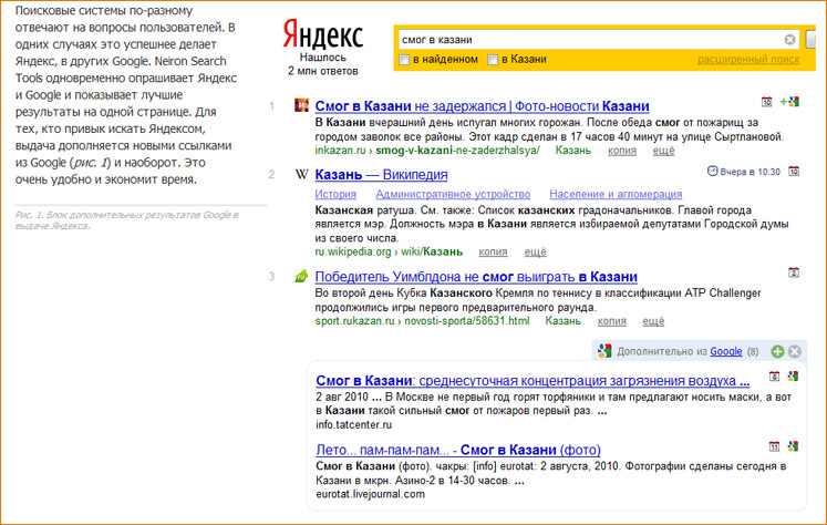 Расширение NeironSearchTools (NST) установлено у 1,5 миллионов русских пользователей браузера FireFox (около 2% всех пользователей Рунета). Это метапоисковый плагин, который при любом запросе в «Яндекс» или в Google показывает пользователю непересекающиеся результаты обеих поисковых машин в привычном интерфейсе. Опция очень удобная. По статистике, результаты Яндекса и Google совпадают, в среднем, всего лишь на 25%, поэтому на одни запросы лучше отвечает первый, на другие – второй. С расширением NST пользователь в одном окне всегда видит лучшее, что смогли предложить оба поисковика, и это значительно экономит время поиска нужной информации.